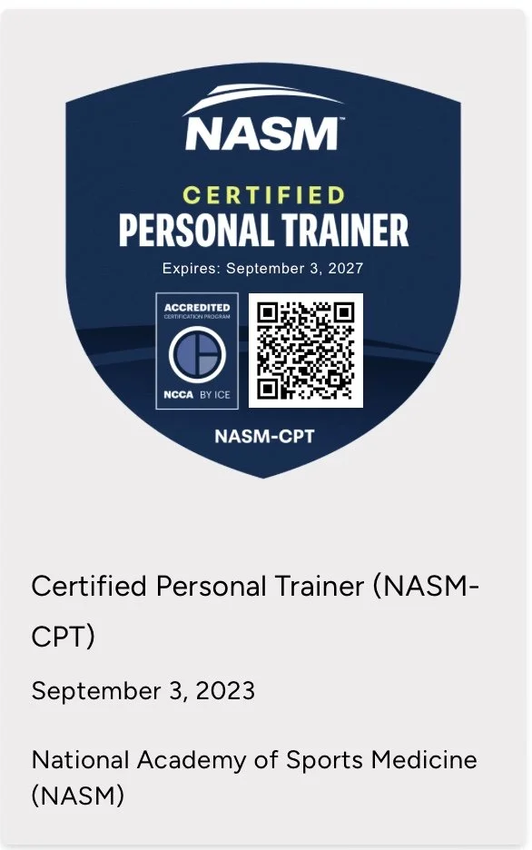 As a dedicated personal trainer, I bring a wealth of expertise to help you achieve your fitness goals. I am a National Academy of Sports Medicine (NASM) Certified Personal Trainer, ensuring a solid foundation in safe and effective training techniques. My specialized training includes: